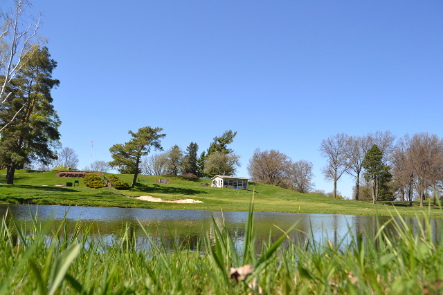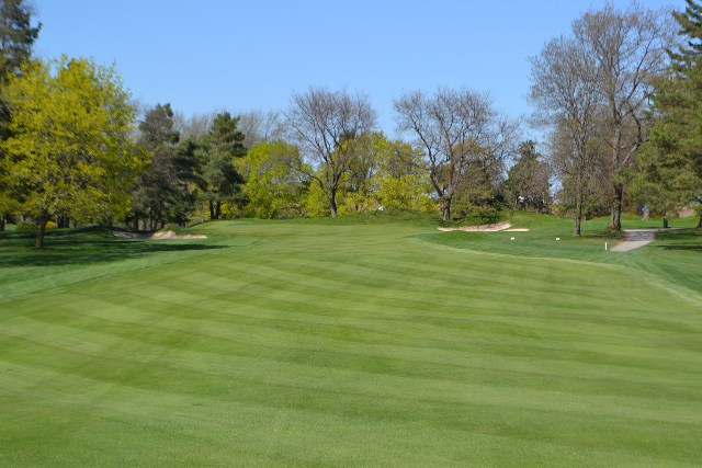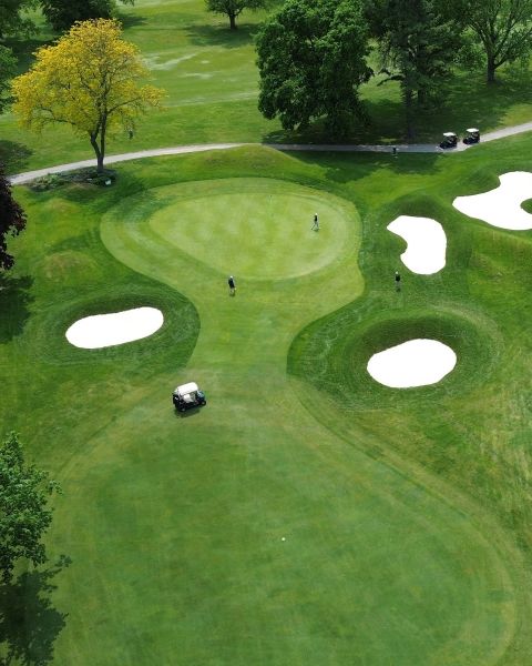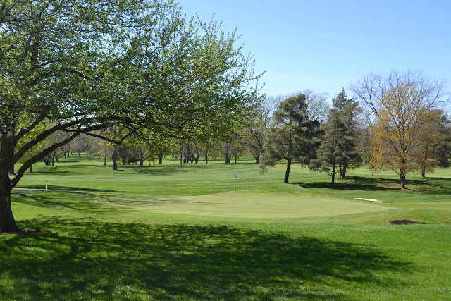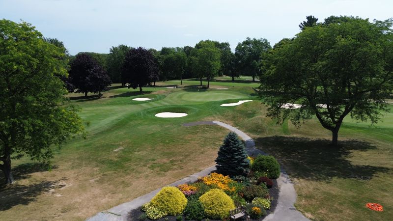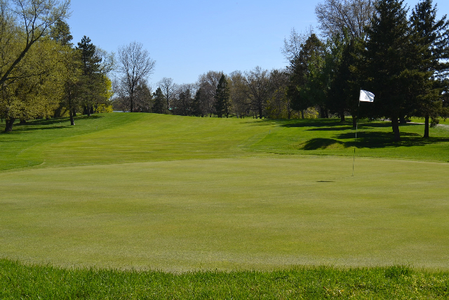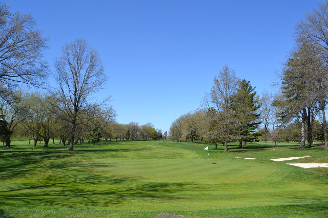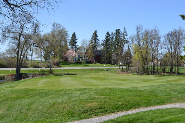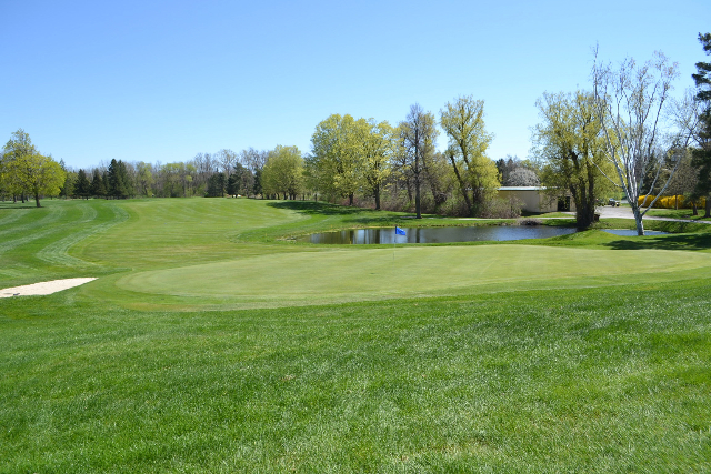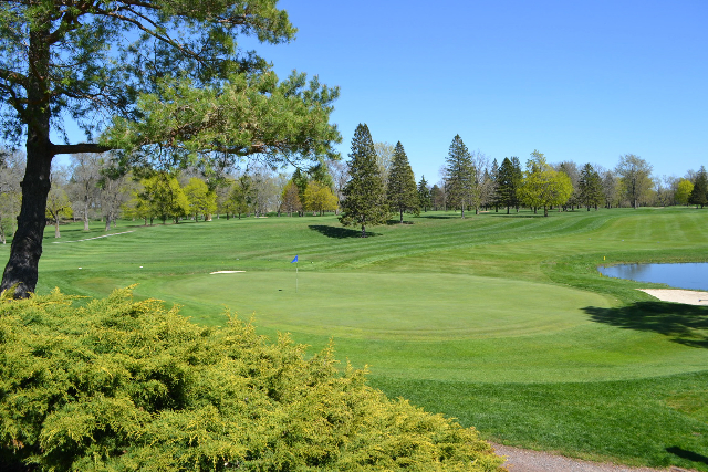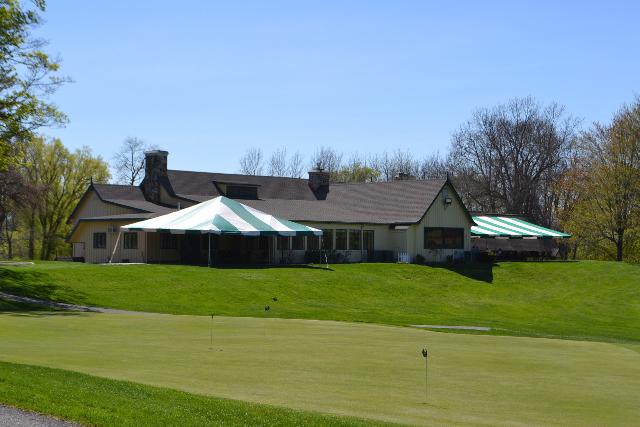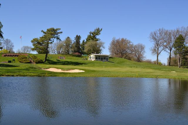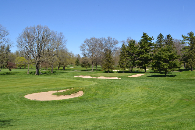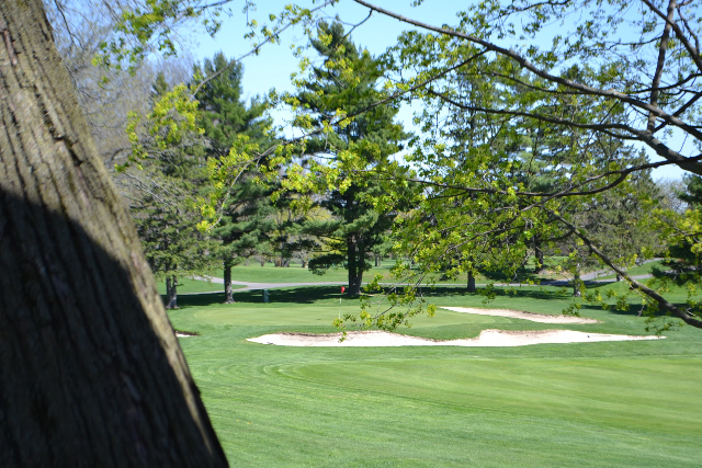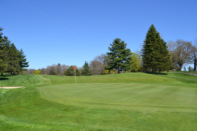 | Hole #18 – The finishing hole is a short 271-yard, par 4, that creates a "risk/reward" dilemma for the longer hitter. Fairway and greenside bunkers are well-placed to catch the errant shot, and a drive just short of the small green will result in a very delicate second shot. With the 18th hole in full view of the clubhouse lounge and the two covered patios, it has been named "the best finishing hole for spectators" in the Rochester District. |